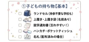 - 子どもの持ち物は上履き・就学通知書・ハンカチが基本。ランドセルの要否は必ず確認。